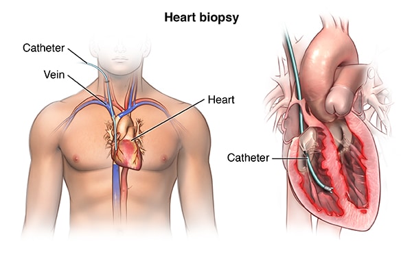 Heart biopsy. Sometimes, a heart biopsy will be done as part of cardiac catheterization, especially if your doctor suspects you have heart inflammation and hasn’t been able to confirm that with other tests. In a heart biopsy, a tiny sample of your heart tissue is removed through the catheter and is sent to a lab for testing.